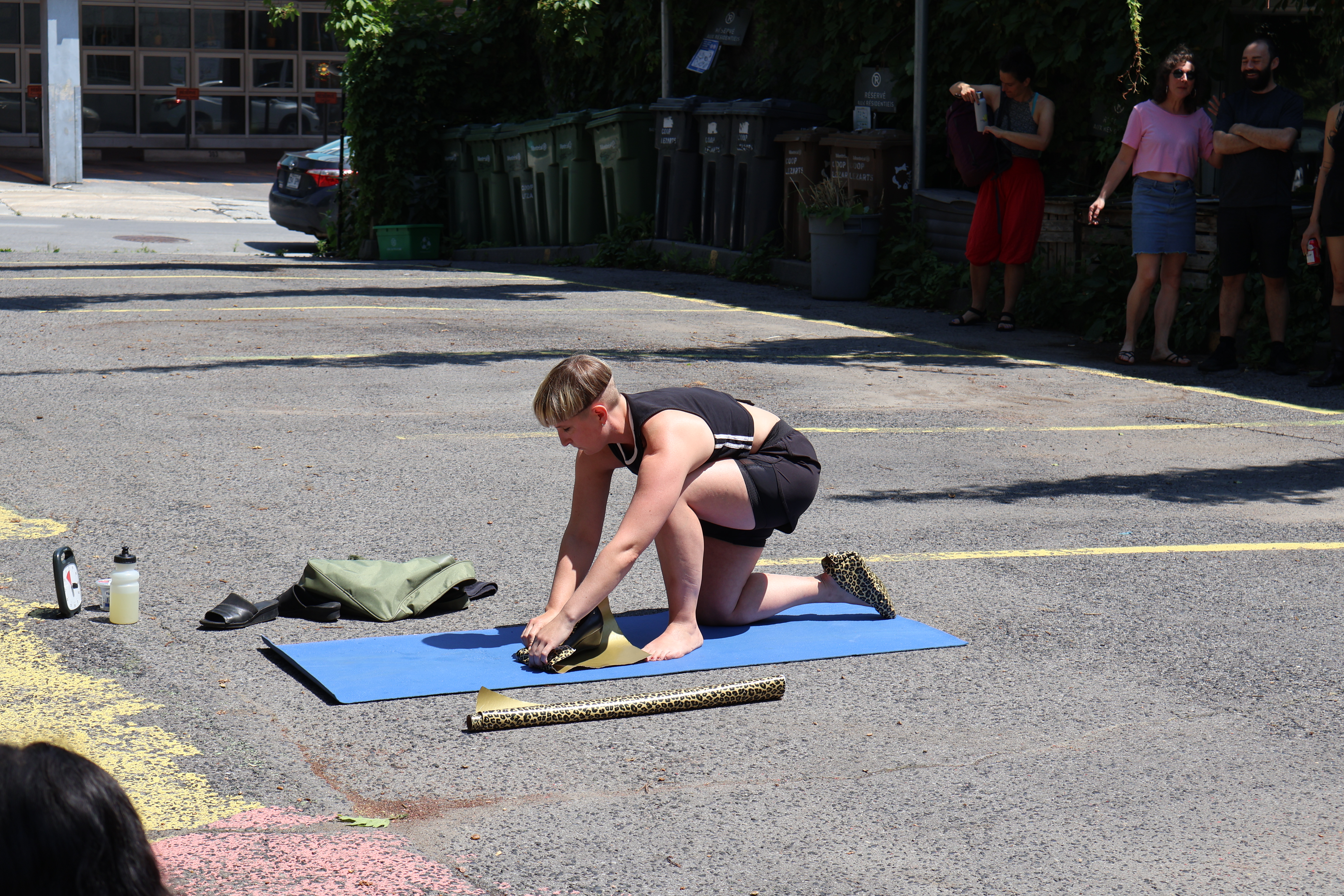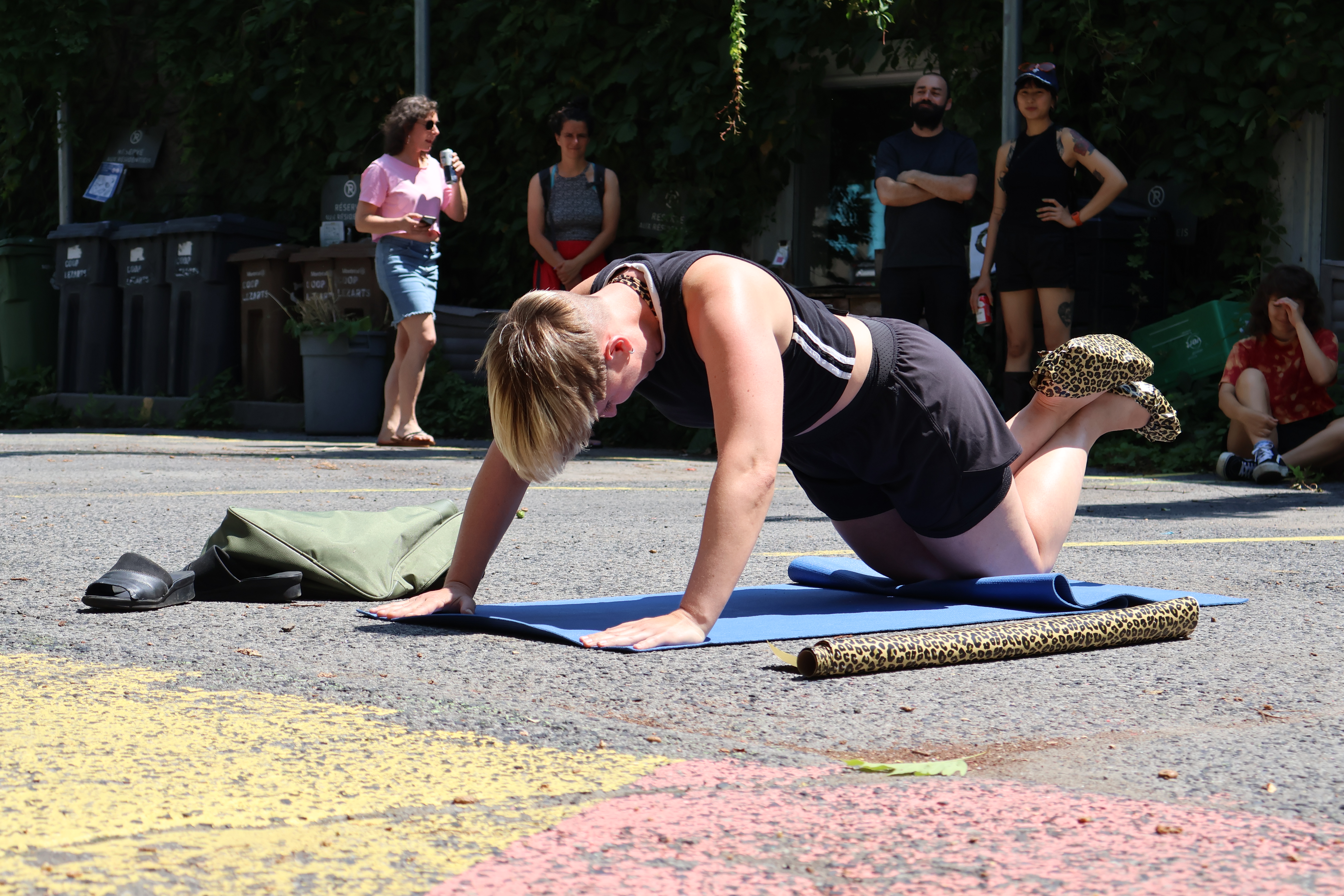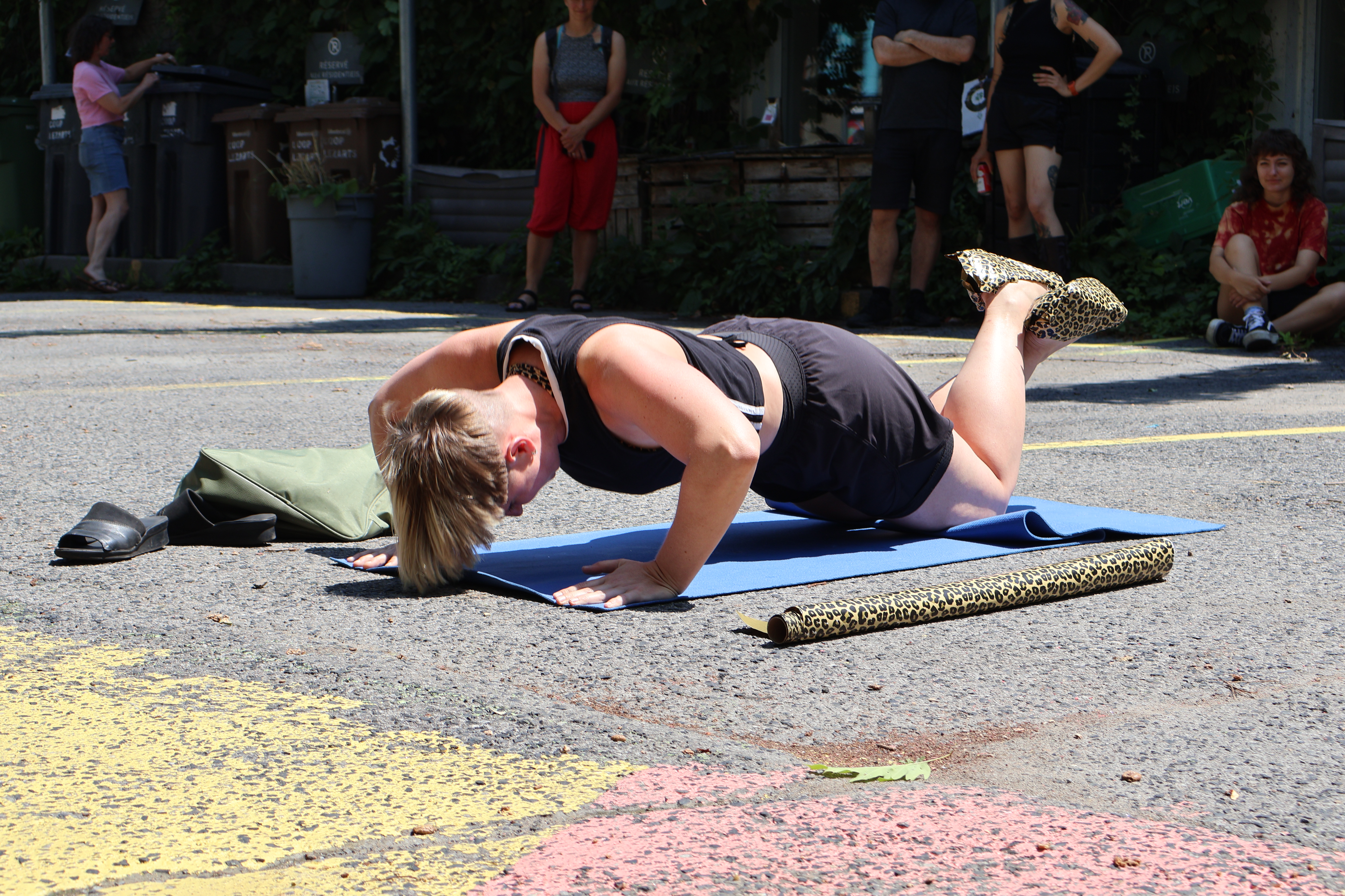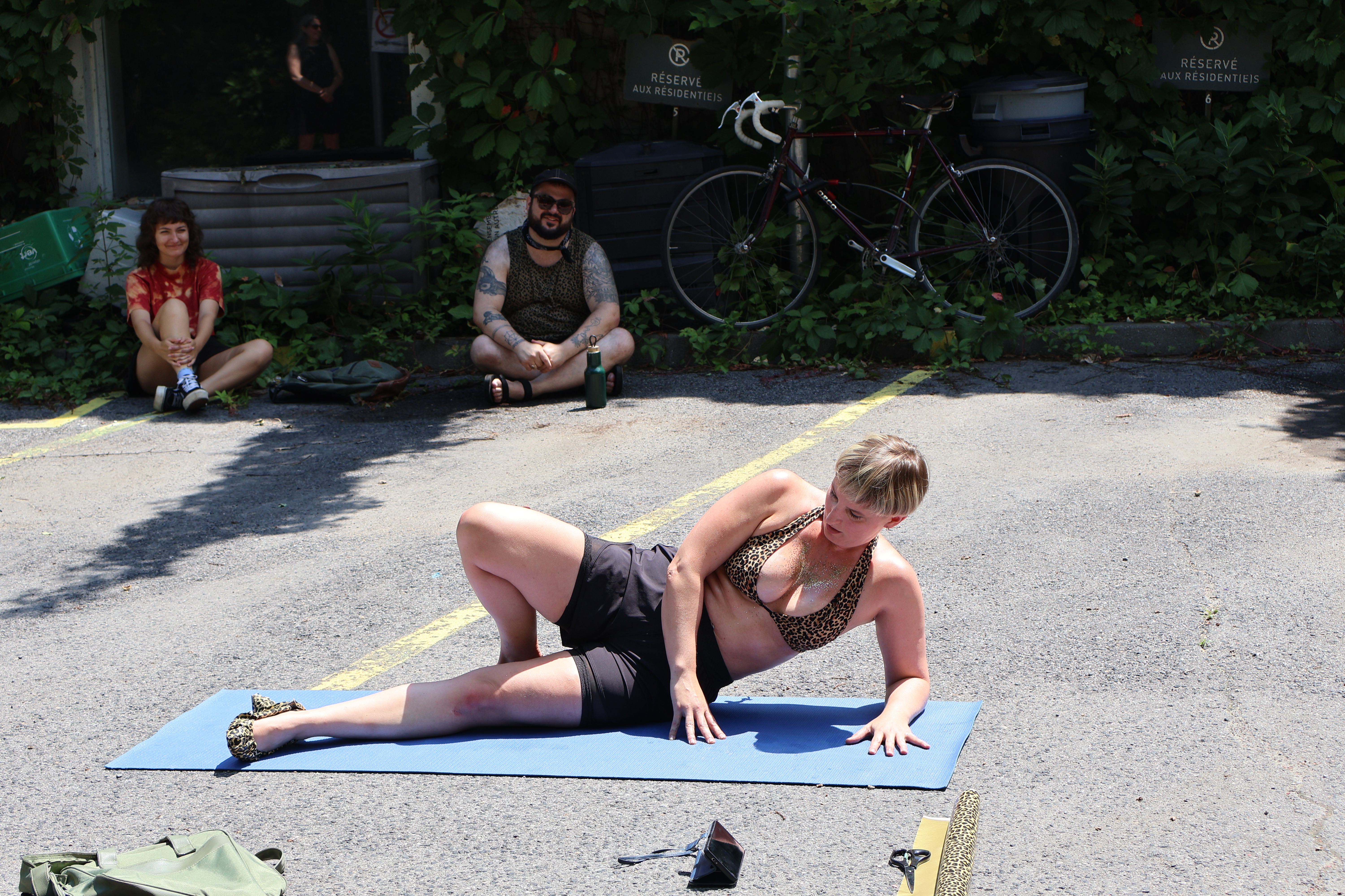 Dans cette proposition, j’aborde avec sensualité mon identité de femme Queer à travers l’effort et je critique le sexisme dans le vocabulaire sportif utilisé dans ma jeunesse (ex.: push up de filles).